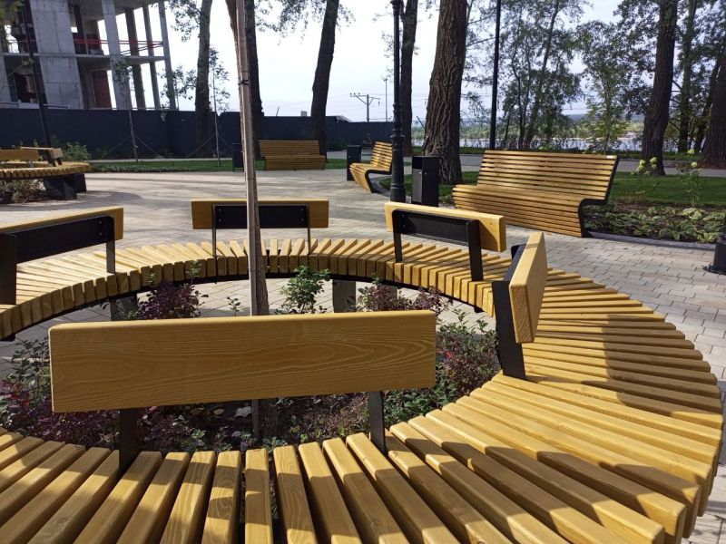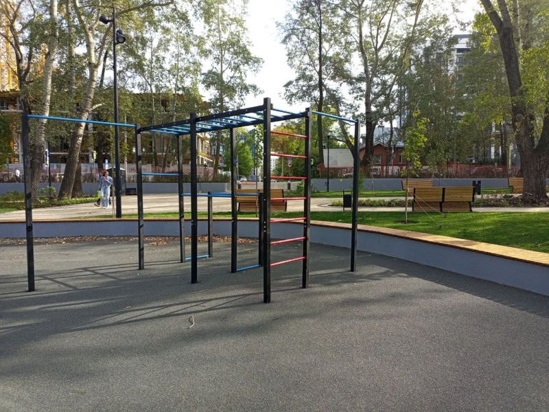 Отреставрирована подпорная стена, установлены новые урны, скамейки, качели, покрашены и обновлены тренажёры на спортивной площадке. В саду установлены настоящие газовые фонари.