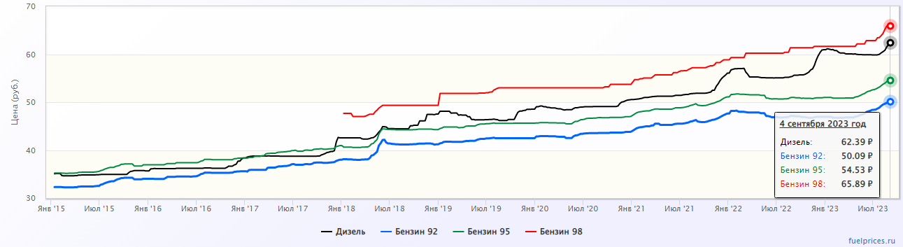 Бензин марки АИ-92 подорожал на 22 коп. — с 49,87 до 50,09 руб., АИ-95 — на 22 коп. — с 54,32 до 54,53 руб. Стоимость АИ-98 уже несколько недель остаётся на одном уровне — 65,89 руб.