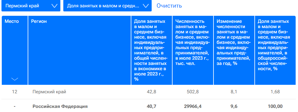 Пермский край в этом списке расположился на 12 месте. В нашем регионе доля занятых в МСБ составила 42,8% (1,68% от общероссийской численности), или 502,8 тыс. чел. Этот показатель за год вырос на 8,1%.
