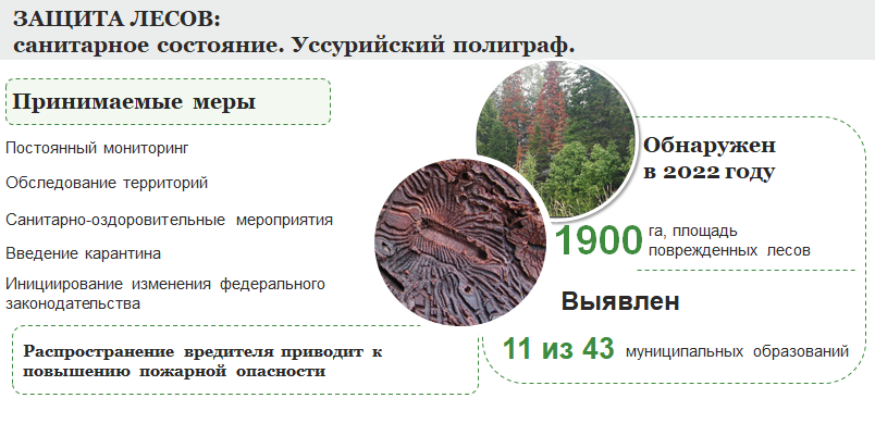 Чтобы остановить дальнейшее распространение карантинного вредителя, краевые власти инициировали внесение изменений в федеральное законодательство, и уже получена поддержка тех субъектов, которые столкнулись с это проблемой. Поэтому в ближайшее время появится возможность повысить эффективность борьбы с уссурийским полиграфом.