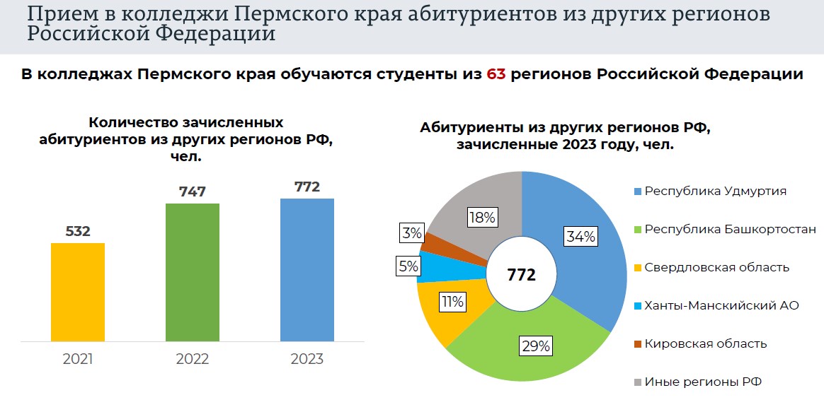 «В этом году именно абитуриентов только приехало 772 человека. Это огромное количество. Ещё несколько лет назад их было 60-70 человек. Наша задача не только принять их и обеспечить качественное обучение, но и сделать всё возможное, чтобы они оставались в Пермском крае. Большинство из них, примерно 67%, действительно остаются», — пояснила чиновница.