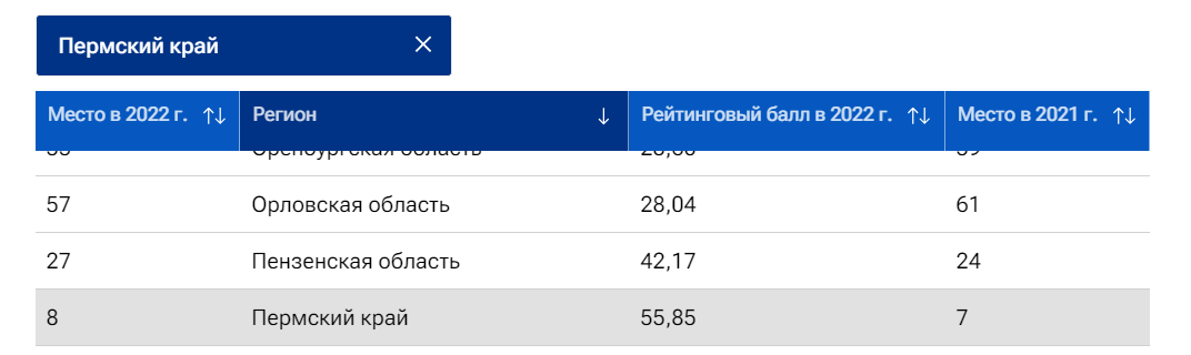 Пермский край вошёл в первую десятку, заняв восьмую позицию с рейтинговым баллом в 55,85. При этом в 2021 году Прикамье занимало седьмое место в этом рейтинге.