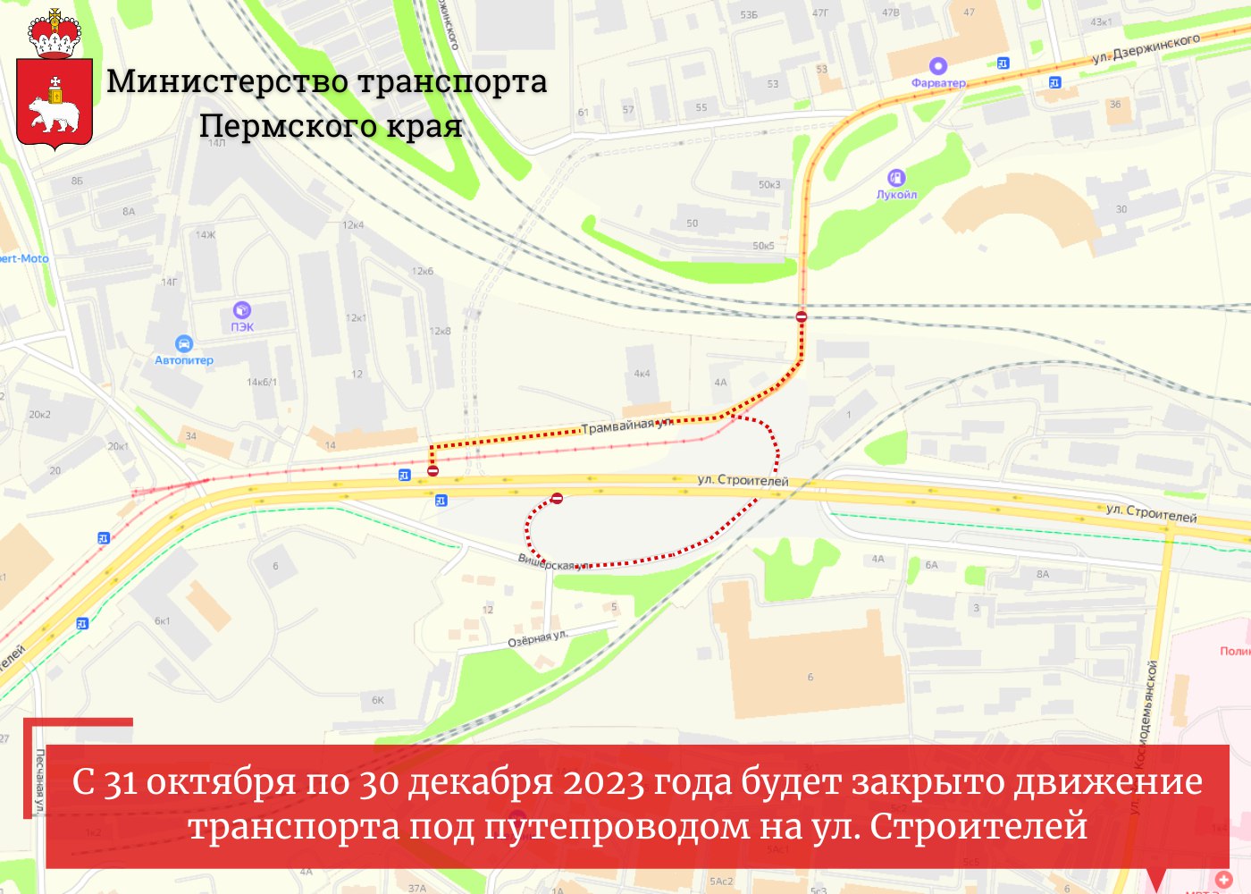 Движение транспорта под путепроводом на ул. Строителей от ул. Вишерской до ул. Трамвайной в Перми будет полностью перекрыто на два месяца, с 31 октября до 30 декабря 2023 года. Об этом сообщает «Рифей» со ссылкой на региональный минтранс.