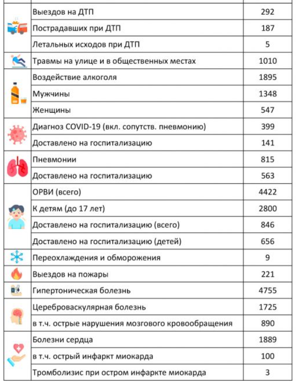 Из-за коронавируса врачей скорой вызывали 399 раз, на ДТП — 292, на пожары — 221. Также было зарегистрировано 9 вызовов из-за переохлаждения и обморожения. Ранее сообщалось, что в конце октября температура воздуха в Пермском крае упала ниже -10 градусов. Это редкое для региона явление.
