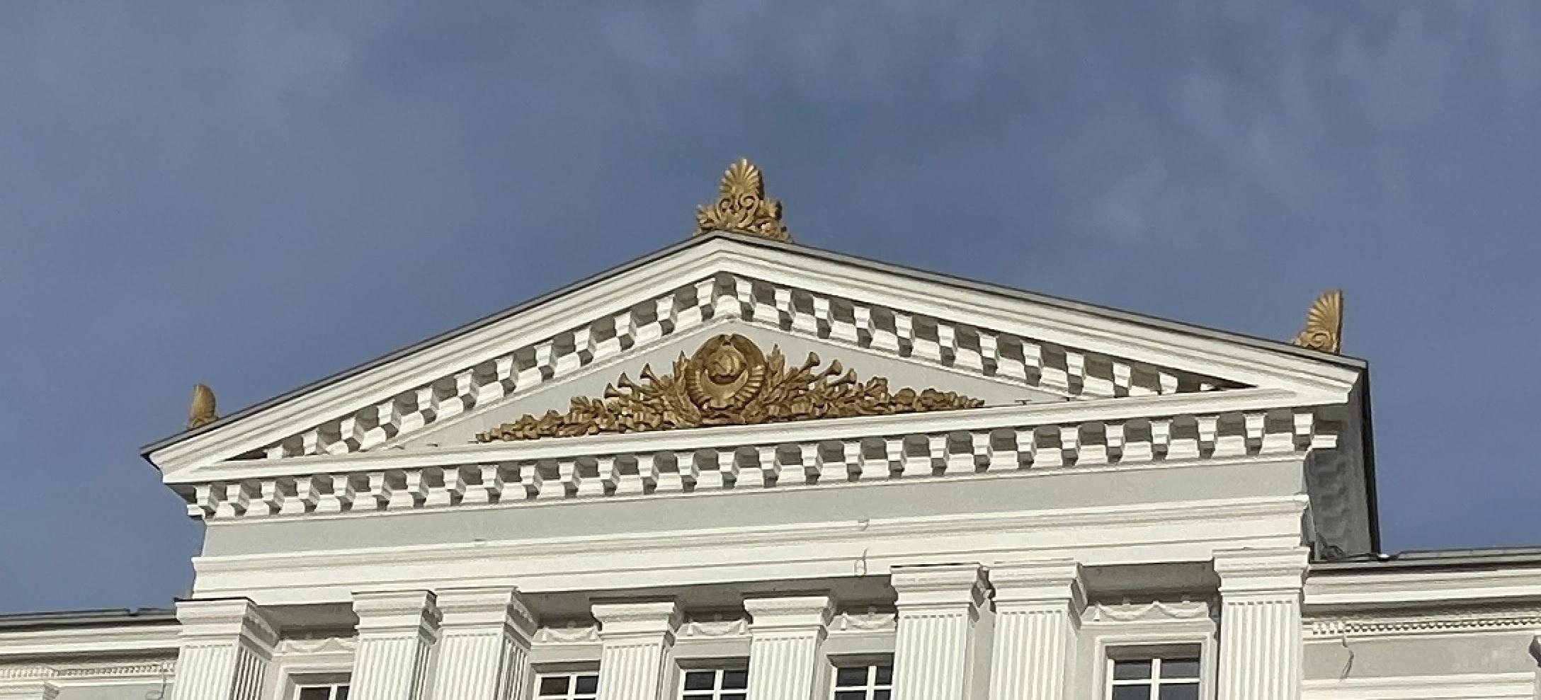 В Перми на театре оперы и балета завершилась реставрация герба СССР и скульптурных украшений над углами фронтона.