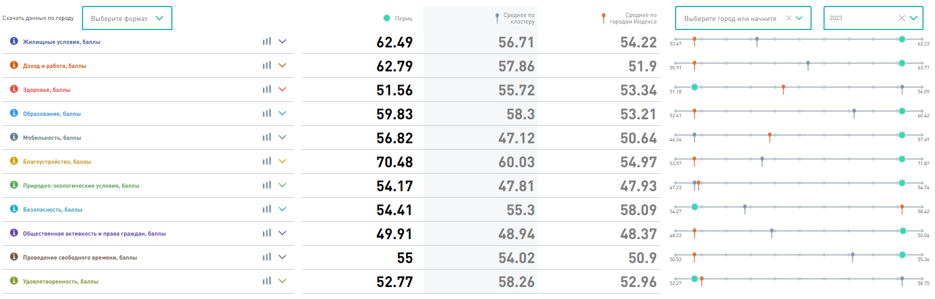 Кроме того, он обратил внимание, что город стал лидером по нескольким направлениям. Мобильность, или удобство передвижения в городе, выросла за счёт развития улично-дорожной сети и пешеходной инфраструктуры (56,8 балла при среднем показателе в кластере — 47,1 балла). Высокие баллы оказались и по критериям жилищных условий (62,4, среднее — 56,7 балла) и благоустройства (70,4, среднее — 60 баллов) благодаря оформлению и озеленению города. Высокая оценка в 62,7 балла, при среднем по кластеру в 57,8 балла, Пермь получила в направлении «Доход и работа», это указывает на хорошие условия для трудоустройства и профессионального развития.