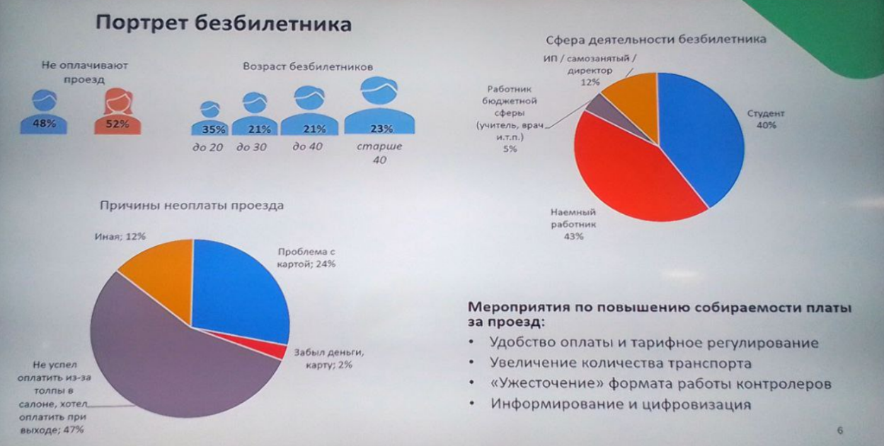 «По трудоустройству, в основном, это студенты или школьники старших классов, а также сотрудники различных предприятий. Если говорить о причинах, по которым они не оплачивают проезд, то наиболее часто говорится, что они хотели платить позже, либо при выходе, но эти причины тоже надо фильтровать, потому что, скорее всего, у них просто не было желания оплачивать проезд. Вторая по частоте категория неоплаты — проблемы с валидатором или банковской картой. Ещё одна часто называемая причина — переполненность салона, когда проблематично подойти к валидатору», — рассказал Путин.