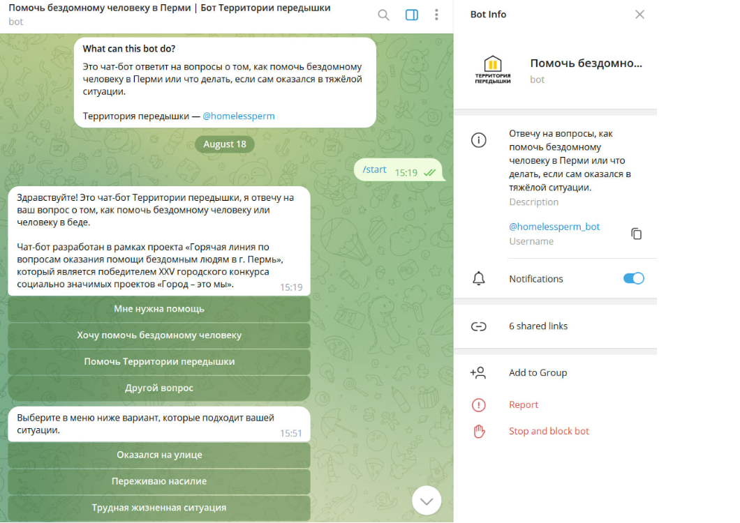 Коллектив благотворительной организации «Территория передышки» запустил чат-бот в Telegram, с помощью которого можно узнать, как помочь бездомному человеку в Перми или что делать, если сам оказался в тяжёлой ситуации без крыши над головой. Об этом волонтёры рассказали в соцсетях.