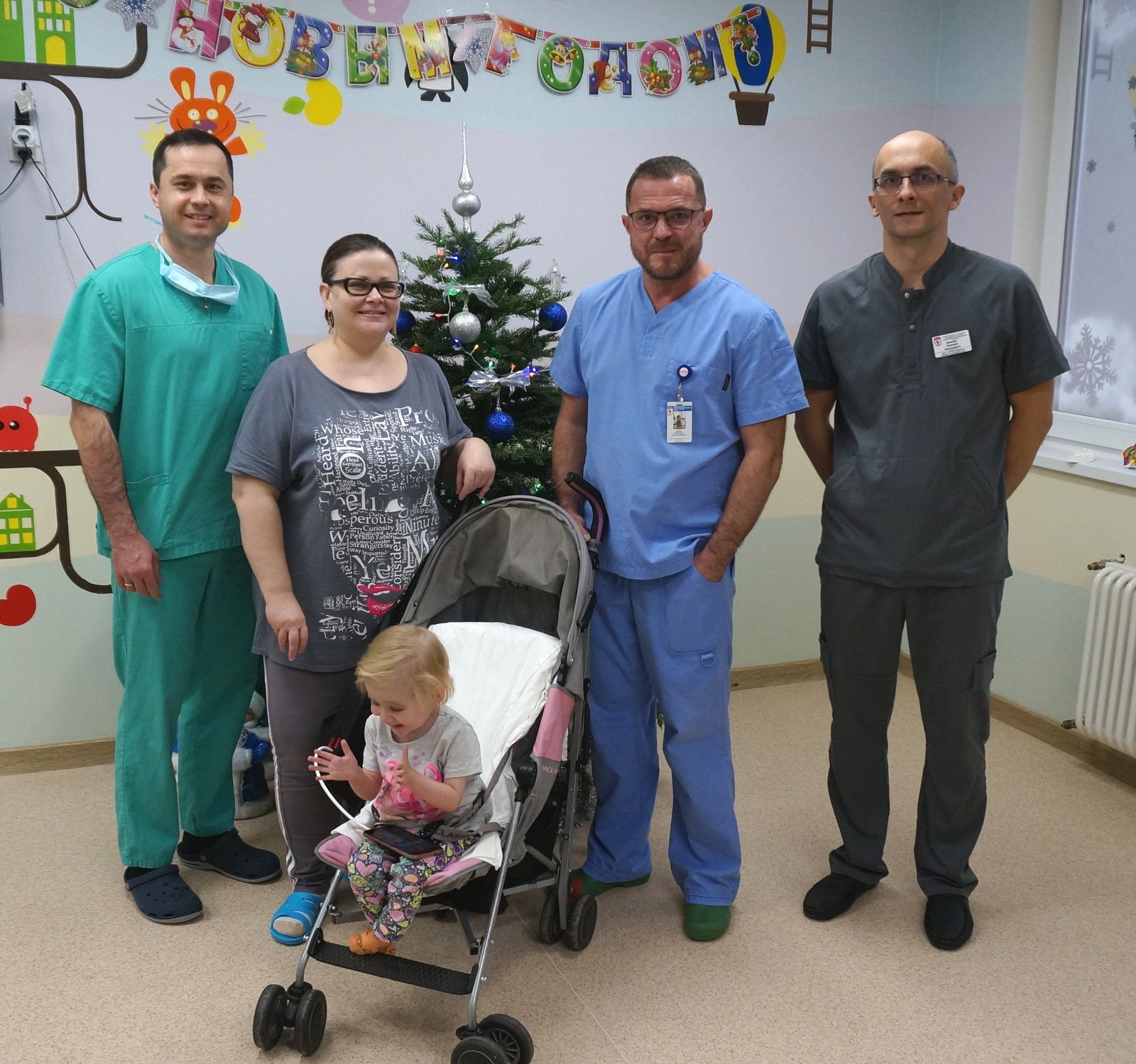 На фото с Василисой и ее мамой Татьяной (слева направо): заведующий детским кардиохирургическим отделением Роман Шехмаметьев, главный врач Вячеслав Белов, детский кардиолог Алексей Биянов
