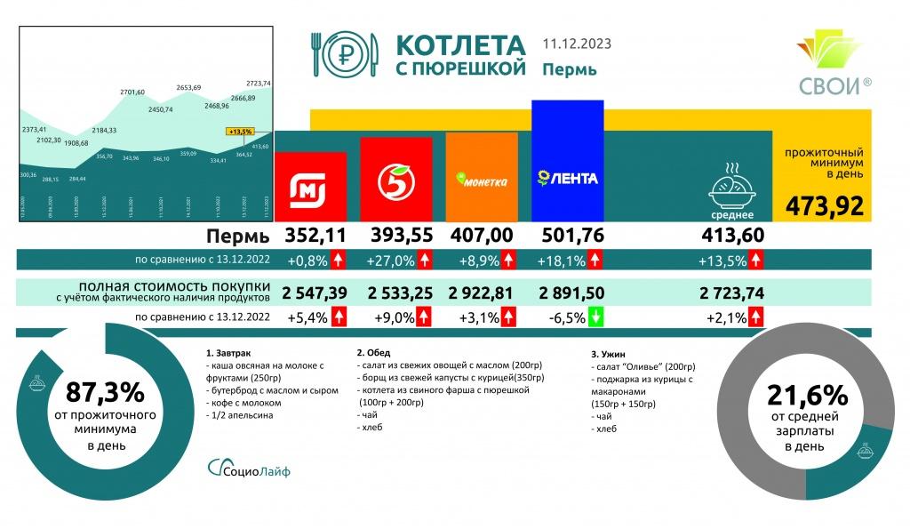 «Самый дешёвый вариант "котлеты с пюрешкой" в Перми стоит 352,1 руб. (сеть магазинов "Магнит"), самый дорогой — 501,7 руб. (гипермаркет "Лента"). В пермских "Пятёрочках" и "Монетках" цена суточного рациона примерно одинакова (393,5 и 407 руб. соответственно)», — отмечают аналитики.