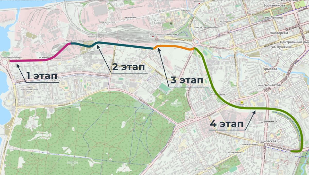 Первая очередь дороги от ул. Куфонина до ул. Вишерской уже сдана в эксплуатацию. Сейчас заканчивается возведение второй — от ул. Вишерской до примыкания к ул. Папанинцев. Ведутся работы на третьем этапе — от ул. Папанинцев до площади Гайдара. Общая стоимость проекта оценивается в 14,9 млрд руб. Завершить все работы чиновники обещают к 2030 году.