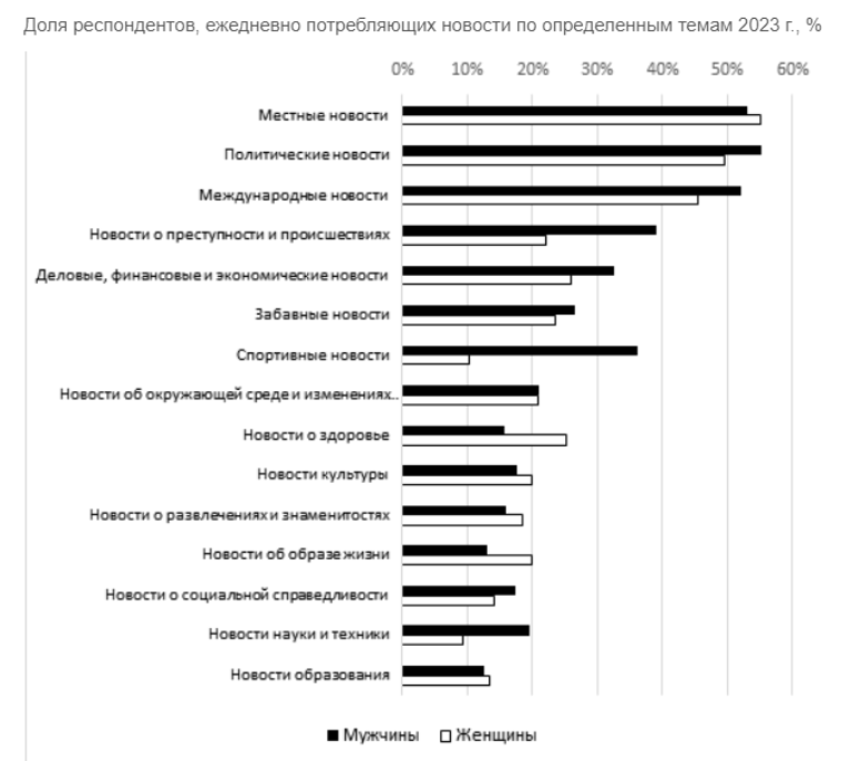 Кроме того, мужчины чаще следят за спортивными новостями (36% против 10%) и новостями науки (20% против 9%).