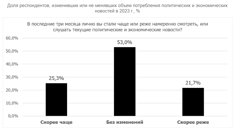 Тем не менее, как указывают учёные, в 2023 году сократилось количество россиян, которые не являются потребителями новостей, — всего 4,6% населения заявили, что не следят за новостями. В октябре 2022 года таких респондентов было 13,5%.