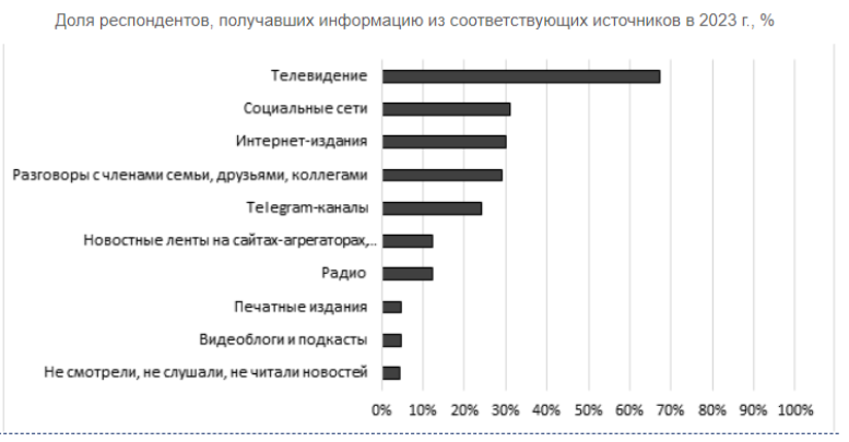 Чаще всего россияне получают новостную информацию по телевизору. Также в тройке лидеров, но с большим отставанием, находятся социальные сети и интернет-издания.