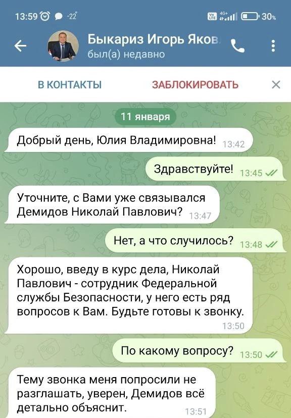 «От моего имени мошенники пишут в Telegram. В сообщениях злоумышленники пытаются войти в доверие и вежливо предупреждают о том, что нужно быть готовым к звонку из ФСБ с просьбой о неразглашении информации», — написал Быкариз на своей личной странице.