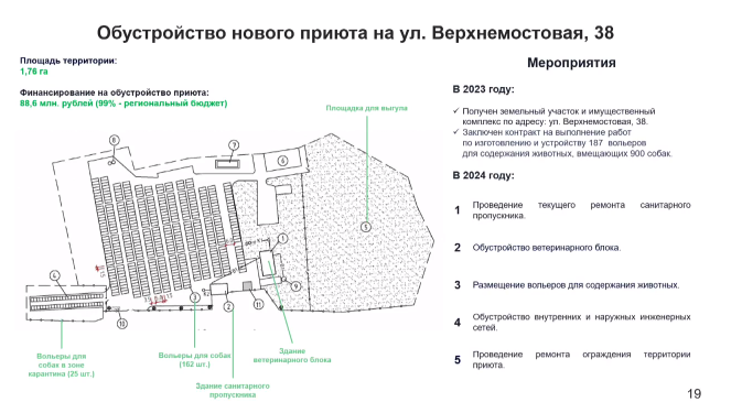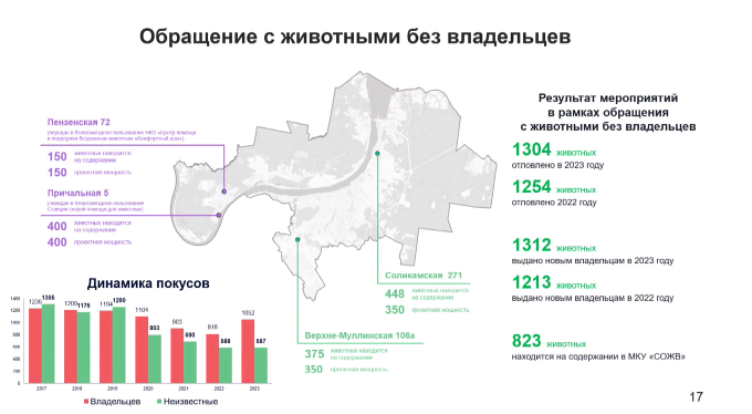 Ольга Андриянова также рассказала, что планируется ввод нового приюта на ул. Верхнемостовой, 38, который рассчитан на 900 собак. Это позволит закрыть слабо приспособленное учреждение на ул. Соликамской.