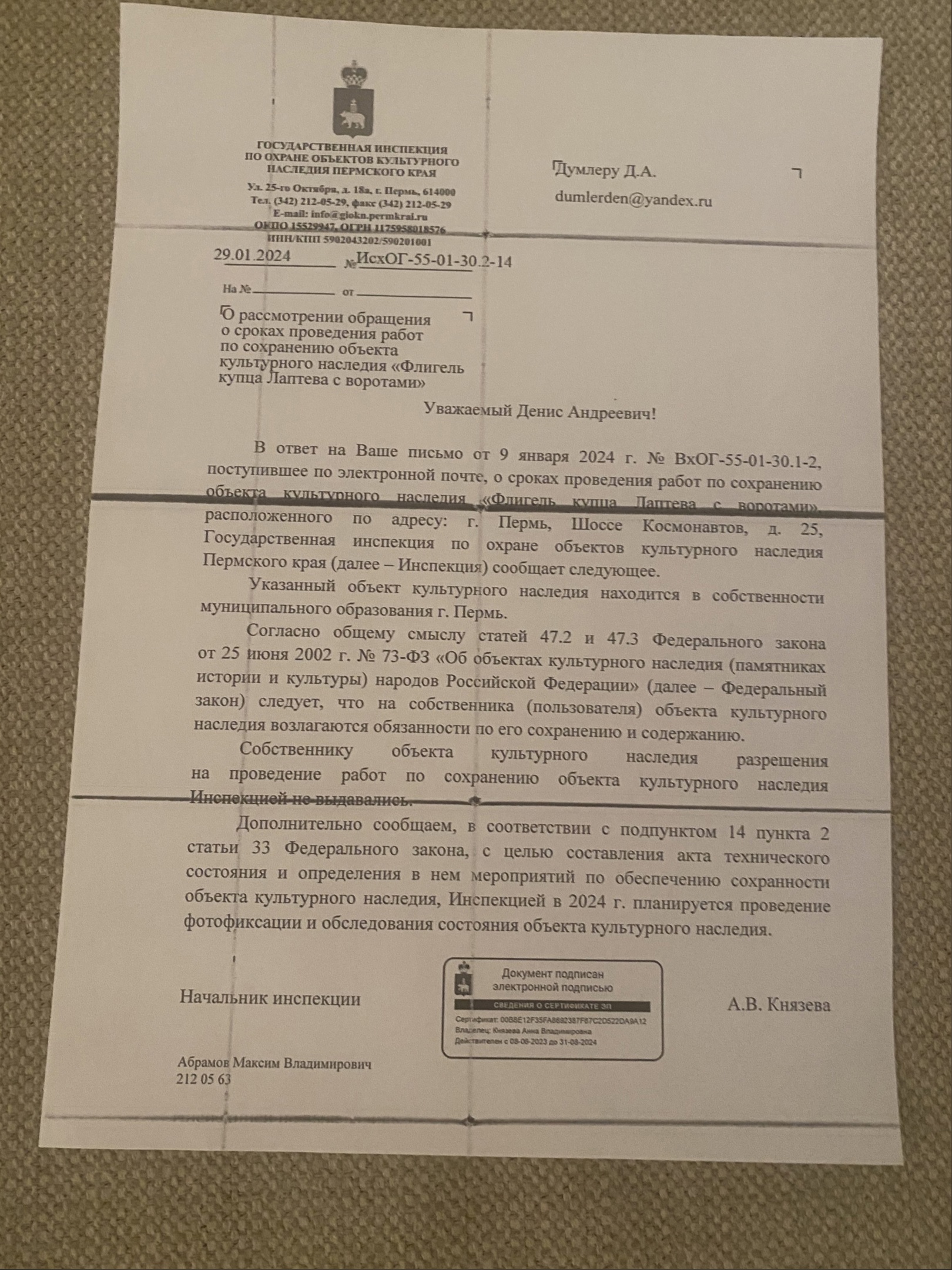Пермский историк и общественный деятель Денис Думлер опубликовал на своей странице ВКонтакте ответ Госинспекции по охране объектов культурного наследия Пермского края на свой запрос о судьбе исторического здания, которое расположено по ш. Космонавтов, 25.
