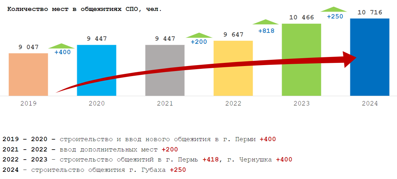 В целом с 2019 по 2024 год в Пермском крае количество мест в общежитиях выросло на 1668. Только новые объекты в Перми и Чернушке, построенные в 2022-2023 годах, обеспечили студентов средних профессиональных учреждений 1218 местами. На данный момент в общежитиях региона — 10 716 мест.