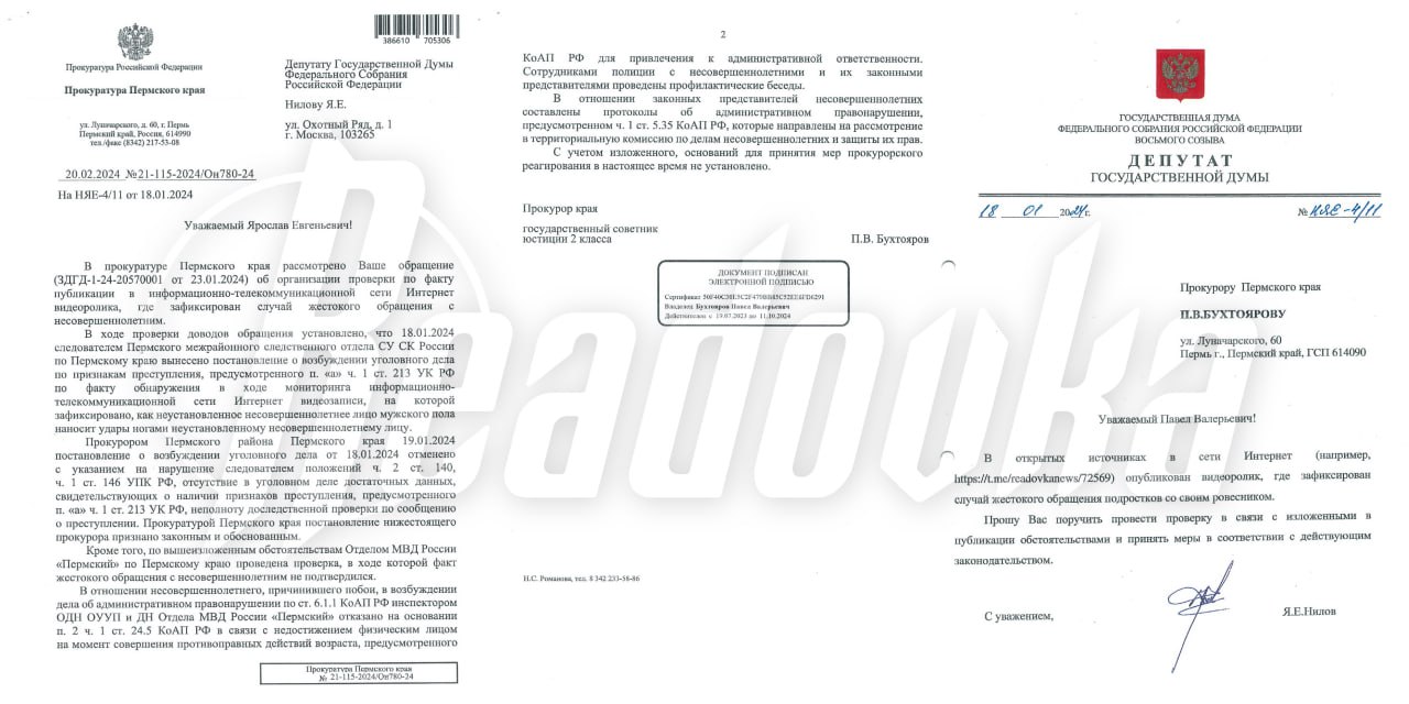 Как выяснилось, проверкой занимался отдел МВД России «Пермский», и они не нашли фактов жестокого обращения с несовершеннолетним, но на родителей подростков были составлены протоколы об административном правонарушении. Материалы поступили в территориальную комиссию по правам несовершеннолетних и защиты их прав.