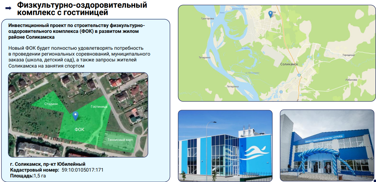 Ещё один проект для туристов и местных жителей в Соликамске предполагает возможность строительства физкультурно-оздоровительного комплекса с гостиницей для занятий спортом и проведения региональных соревнований. Для его размещения рассматривается участок на Юбилейном проспекте, 4.