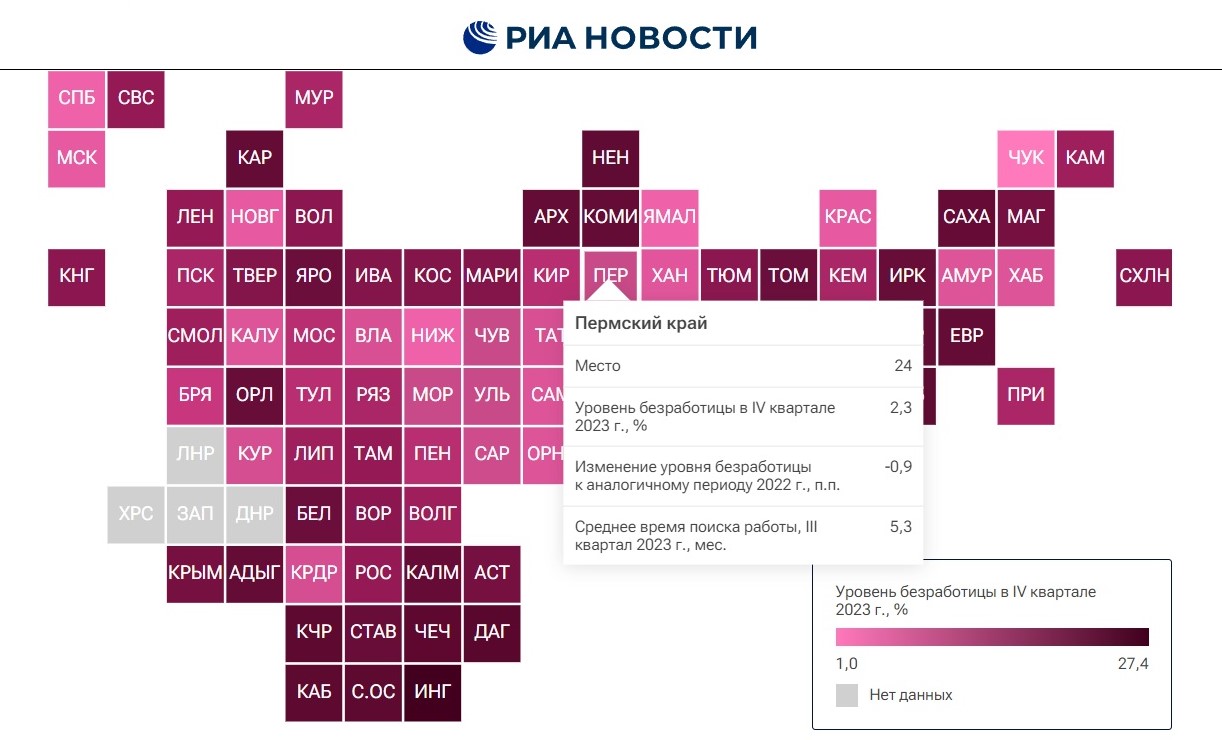 «РИА Новости» опубликовало рейтинг регионов по уровню безработицы по итогам IV квартала 2023 года. Он сформирован по принципу увеличения показателя: первые позиции занимают субъекты с низкой безработицей, на последних — регионы с самым большим числом безработных. Пермский край занял в рейтинге 24-е место.
