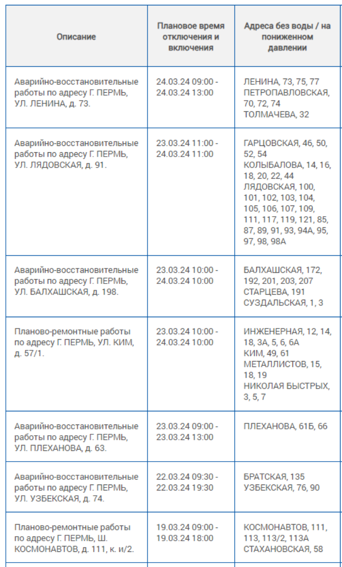 Компания «Новогор-Прикамье» опубликовала график отключения холодной воды в Дзержинском, Индустриальном, Мотовилихинском, Свердловском районах Перми в ближайшие две недели. В основном, отключения связаны с устранениями ранее выявленных утечек, но есть и плановые ремонтные работы. Всего до 24 марта отключения пройдут в 73 многоквартирных домах.