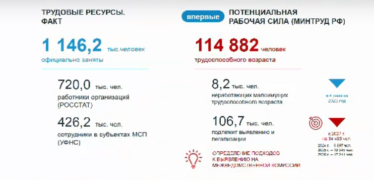 «По итогам 2023 года общая численность официально занятого населения составила 1 млн 146 тыс. человек. Большая часть из них (720 тыс. человек) заняты в организациях, 426 тыс. осуществляют деятельность в сфере малого и среднего предпринимательства», — отметил чиновник.