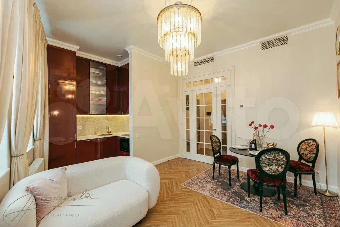 Квартира с дизайнерским ремонтом находится на седьмом этаже, она оборудована мебелью, гардеробной, бытовой техникой и тёплыми полами. Комнаты изолированные, высота потолков — 3,3 м. Общая площадь составляет 52 кв. м, стоимость квартиры составляет 22,9 млн руб.
