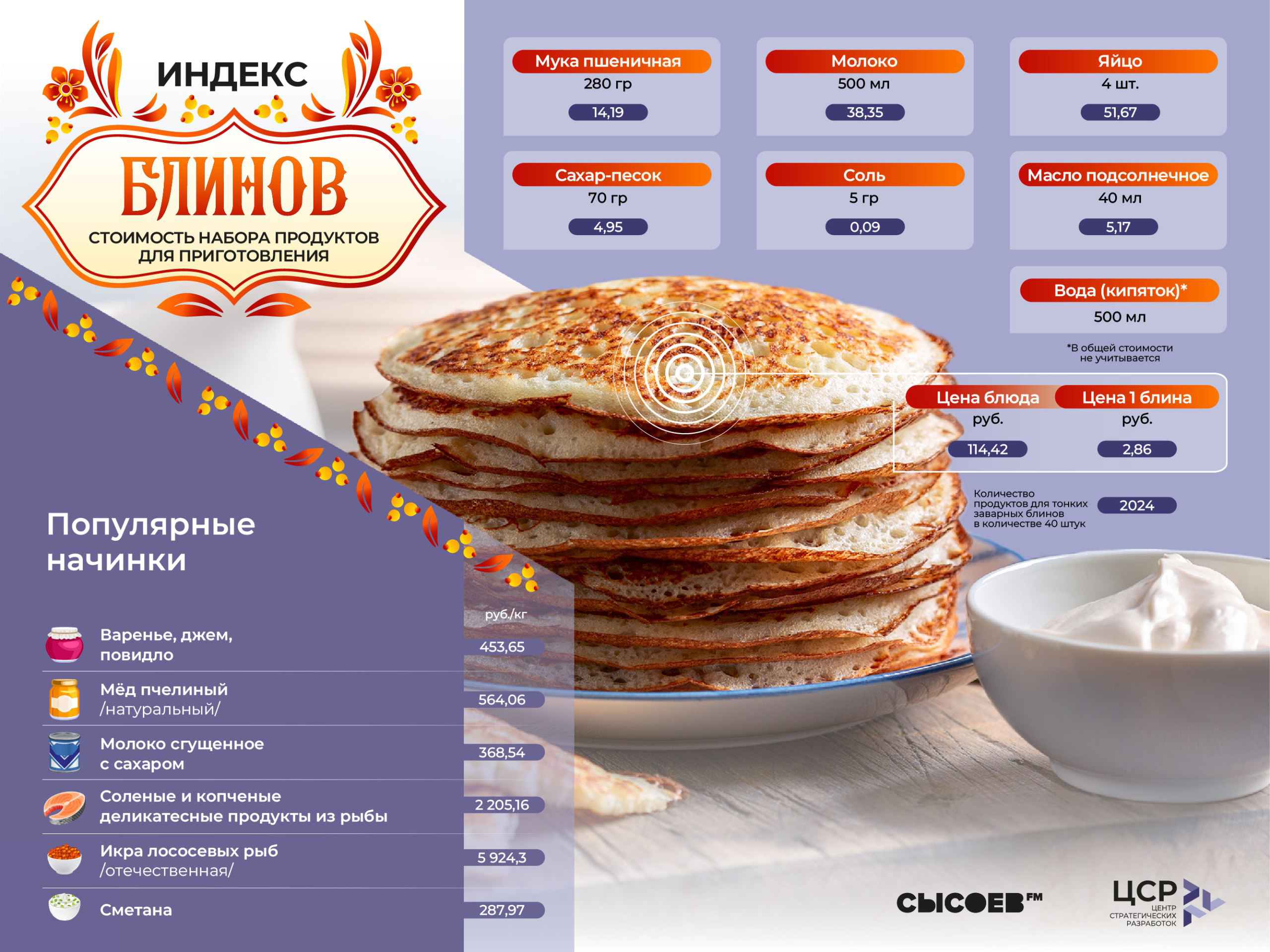 Центр стратегических разработок (ЦСР) совместно с СысоевFM опубликовал данные по индексу блина в Масленичную неделю 2024 года в разных регионах России. В среднем по стране на приготовление 40 блинов (на одну семью) придётся купить продуктов на 114,4 руб. В Пермском крае сумма затрат составит 108,7 руб.