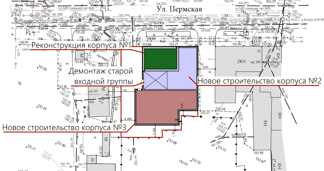 Проект предусматривает демонтаж пристройки, которая была возведена позже, обновление главного корпуса без изменения его существующих габаритов и строительство двух новых корпусов вдоль основной линии фасада и в глубину участка: корпус № 2 высотой в два этажа и административный корпус № 3 в четыре этажа. Также запланировано устройство эксплуатируемой кровли на двухэтажном корпусе, мансардного этажа в корпусе № 2 с панорамными оконными проёмами, имитирующими слуховые окна, и технического подвального этажа для инженерных сетей и котельной. Здание будет оборудовано архитектурно-художественной подсветкой.