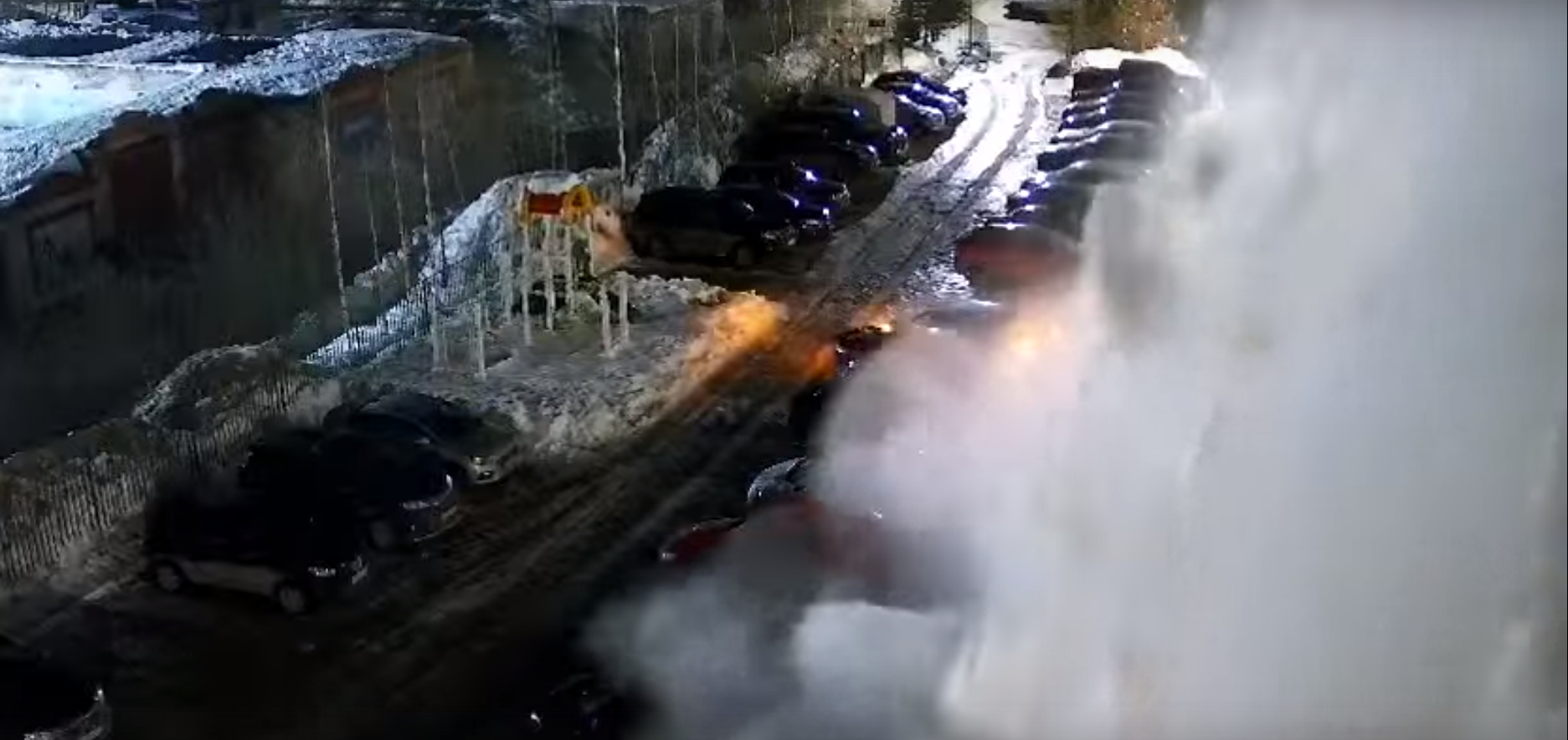 В Соликамске Пермского края с дома № 46 по ул. Северной сошла снежная лавина. ЧП зафиксировала камера наблюдения. На кадрах: жилой двор, тёмное время суток, рядом с подъездом припаркованные автомобили. В одну секунду с крыши здания обрушивается внушительная снежная масса, засыпая и пешеходную дорожку вдоль подъездов, и машины.
