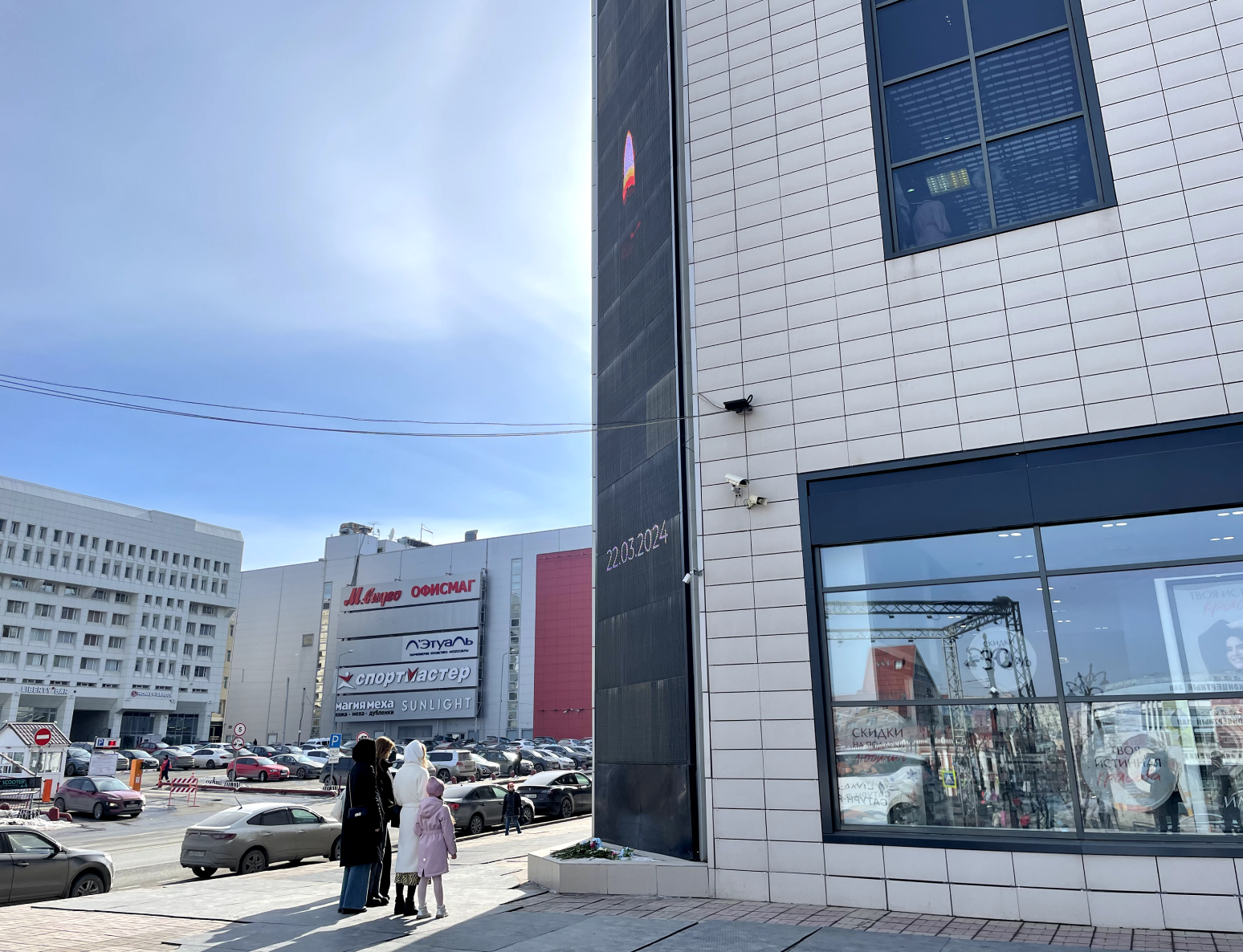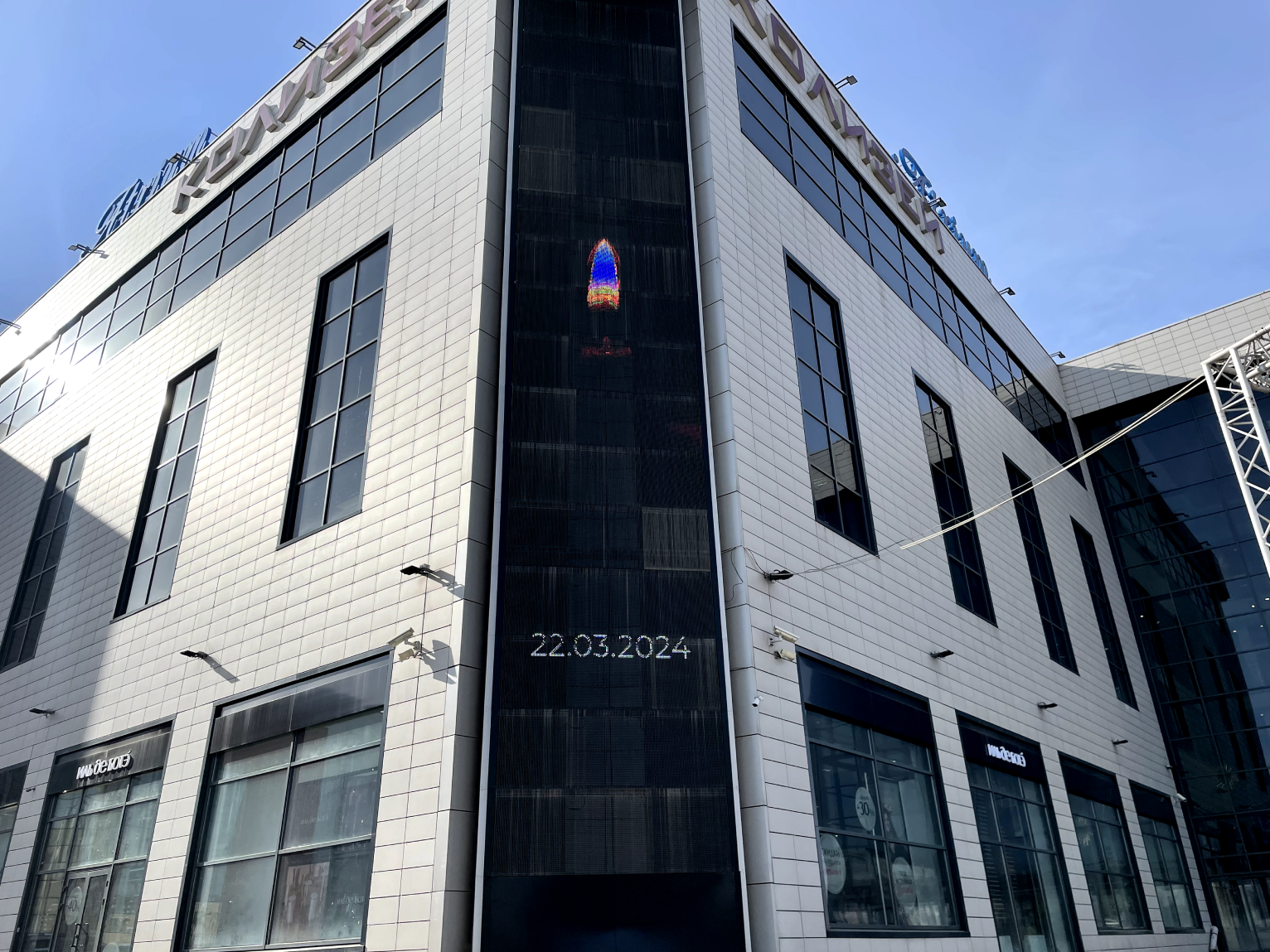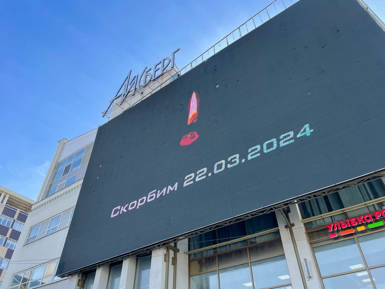 Такая же свеча и надпись «Скорбим 22.03.2024» появились на медиафасаде ТЦ «Айсберг».