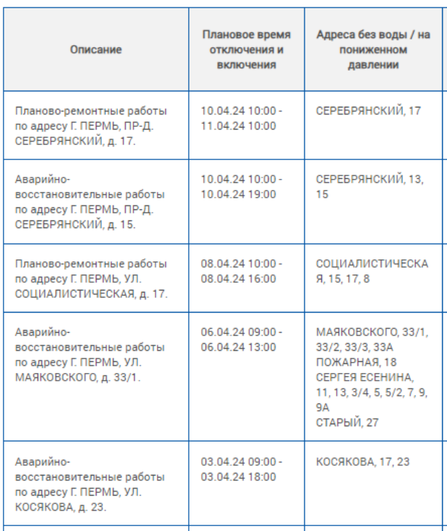 В компании «Новогор-Прикамье» опубликовали график отключения домов от водоснабжения с 30 марта по 10 апреля для проведения плановых ремонтных работ на сетях водопровода.