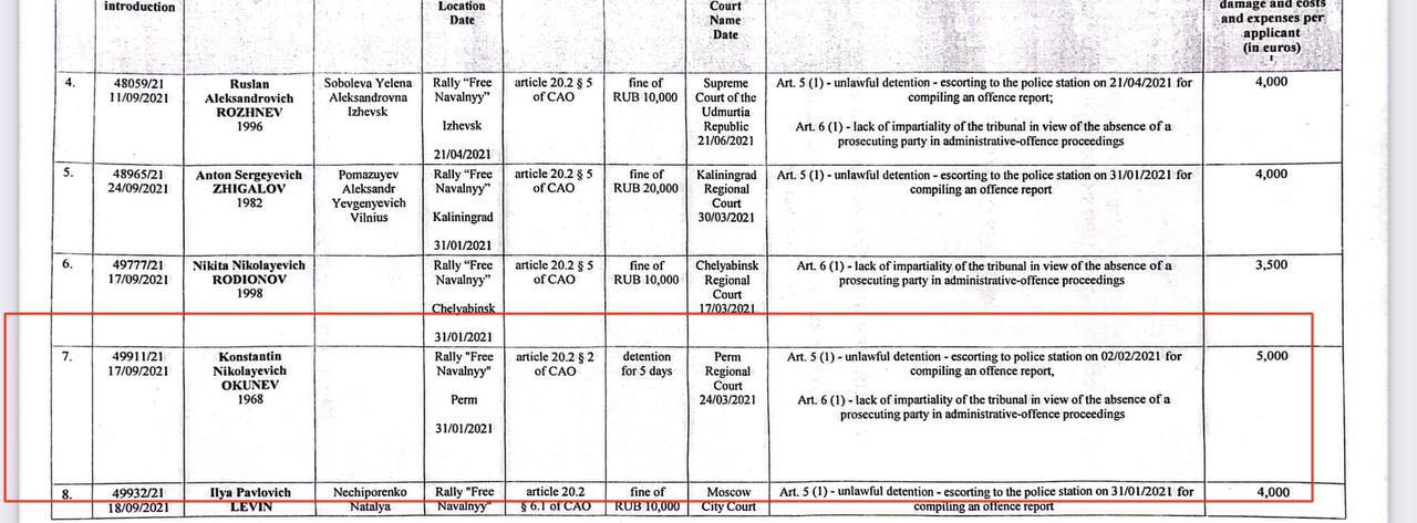 Он рассказал, что «по делу были пройдены все судебные инстанции, включая Верховный суд РФ, и только Европейский суд по правам человека разобрался в ситуации», и 21 марта этого года ЕСПЧ удовлетворил жалобу. Константину Окуневу была назначена компенсация в размере 5 тыс. евро.