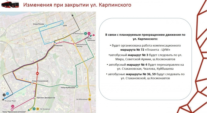 Автобусный маршрут №3 будет следовать с Нагорного по улицам Мира, Советской Армии и ш. Космонавтов, далее по маршруту. Автобус №4 будет перенаправлен на улицы Стахановская, Чкалова и Куйбышева, а маршруты №36 и 59 будут объезжать зону реконструкции по ул. Стахановской и ш. Космонавтов.