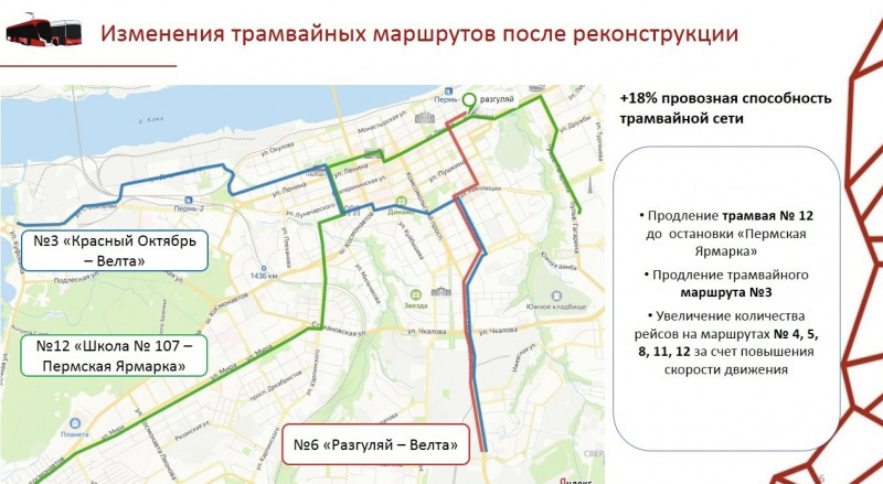 Что касается трамвайных маршрутов, то их планируют сделать основой маршрутной сети в центральной части города. После реконструкции скорость трамвайного сообщения повысится, количество рейсов на маршрутах №3, 4, 5, 8, 11 и 12 увеличится. Ряд маршрутов планируется продлить. Например, трамвайный маршрут №3 будет следовать до «Велты», а маршрут №12 до «Пермской ярмарки».
