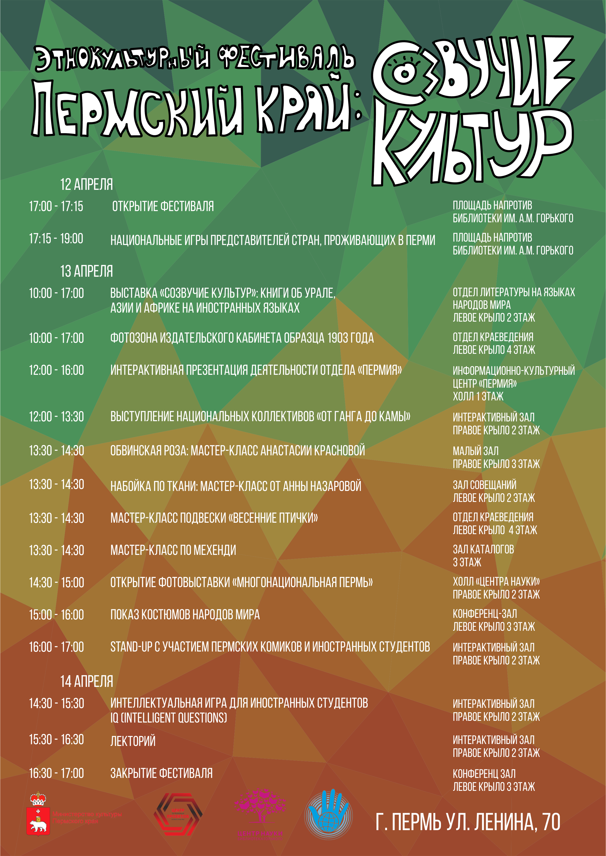 В Перми с 12 по 14 апреля в библиотеке им. Горького пройдёт этнокультурный фестиваль «Пермский край: созвучие культур» (6+), сообщает региональный минкульт.