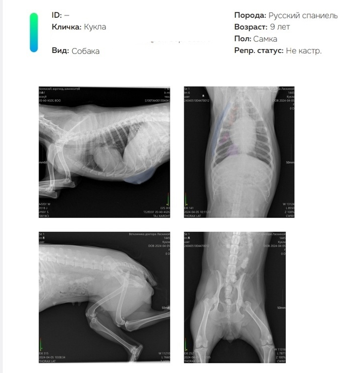 После рентгена выяснилось, что у русского спаниеля по кличке Кукла ушиб грудной клетки, правого лёгкого и брюшной полости, перелом рёбер справа. «Это просто чудо, что не сломан позвоночник и нет переломов конечностей!» — написали ветврачи, добавив, что состояние животного «стабильно тяжёлое». Сейчас собака находится под присмотром волонтёров.