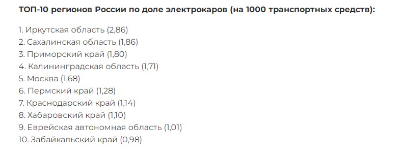 Наибольший рост электрокаров отмечен в Москве: за прошлый год в столице зарегистрировано 6797 электромобилей. Также в топ вошла Калининградская область (рост 150%), Московская область (+105%), Республика Хакасия (+99%), Амурская область (+96%). В тройку лидеров по количеству электротранспорта, помимо Москвы и Московской области, вошёл Краснодарский край — в этом городе сейчас зарегистрировано 2776 электрокаров.