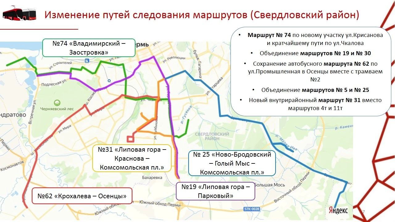 В Свердловском районе Перми на маршруте № 74 ожидается запуск по новому участку Крисанова и кратчайшему пути по Чкалова. Маршруты №19 и 30, а также №5 и 25 объединят. Это позволит соединить микрорайоны и сократить время ожидания. Вместо маршрутных такси 4т и 11т введут маршрут № 31.
