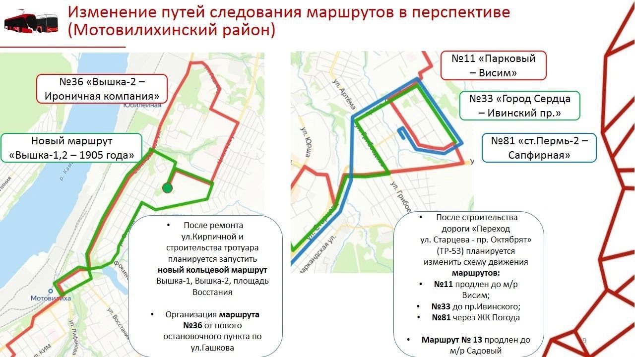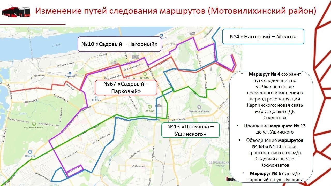 В Мотовилихинском районе изменения позволят организовать новые транспортные связи: №4 сохранит путь следования по Чкалова после реконструкции Карпинского, что позволит создать новую связь Садового с ДК «Солдатова». Маршрут №13 планируется продлить до Ушинского, а №67 — запустить по Пушкина.