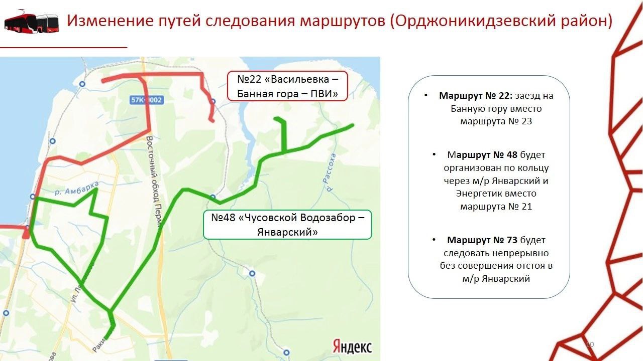Так, автобусы №22 будут заезжать на Банную гору взамен маршрута №23. Движение автобусов №48 предлагается организовать по кольцу через Январский и Энергетик вместо маршрута №21. Автобусы №73 будут заезжать в микрорайон Январский, но их стоянку там уберут.