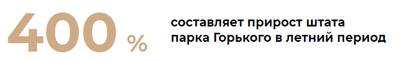 Парк Горького — это нестандартный HR-кейс с экстремально выраженной сезонностью. Штат парка колеблется от 100 человек зимой до 400 летом, причём массовый подбор приходится осуществлять в крайне сжатые сроки и самый неблагоприятный с точки зрения найма период — май—июнь.