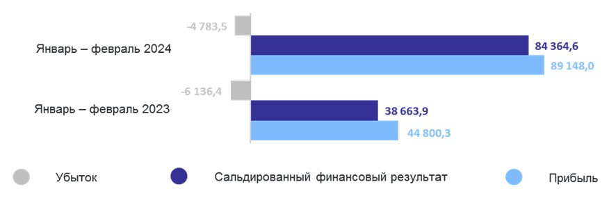 В целом по региону 71,4% обследованных компаний завершили первые два месяца с прибылью в 89,1 млрд руб. Это на 99% выше уровня января-февраля 2023 года. Сумма убытка нерентабельных организаций уменьшилась на 22% и составила 4,8 млрд руб.