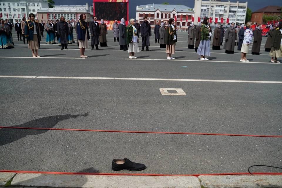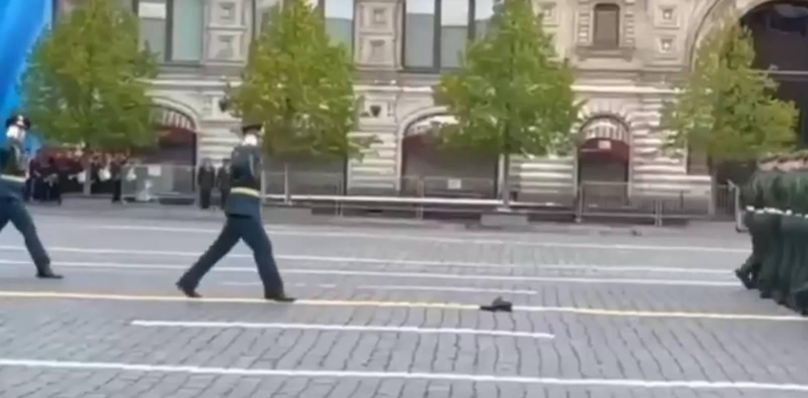 Аналогичный случай произошёл сегодня на Красной площади в Москве. Кто-то из участников Парада Победы потерял ботинок, на этот раз мужской, но не остановился и продолжил путь.
