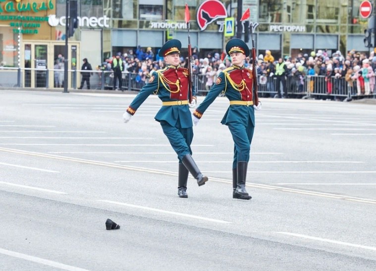 Аналогичный случай произошёл сегодня на Красной площади в Москве. Кто-то из участников Парада Победы потерял ботинок, на этот раз мужской, но не остановился и продолжил путь.