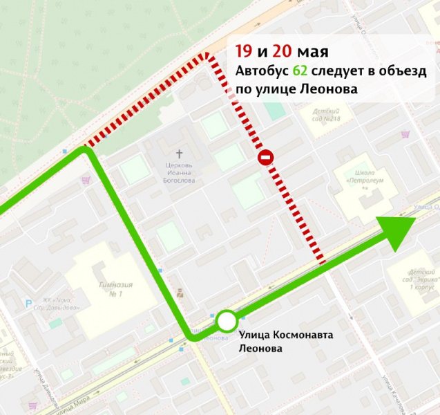 Автобусы, которые следуют в сторону м/р Крохалева, будут курсировать по ул. Леонова вместо ул. Качалова. Таким образом, временно не будут обслуживаться остановки «Улица Леонова» (по ш. Космонавтов) и «Улица Качалова». Пассажирам можно будет пользоваться остановками «Улица Леонова» (по ул. Мира) и «Улица Одоевского».