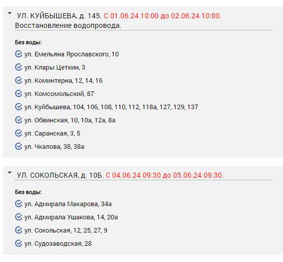 Следующие отключения проводятся в выходные. Это делается для того, чтобы не нарушать работу школ, детских садов и других социальных учреждений. Также стало известно об отключении воды на следующей неделе в домах на ул. Сокольской.