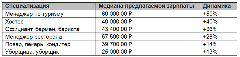 Более всего выросло количество вакансий для хостес — этот показатель увеличился в два раза за рассматриваемый период. Число вакансий для поваров выросло на 70%, официантов — на 47%.