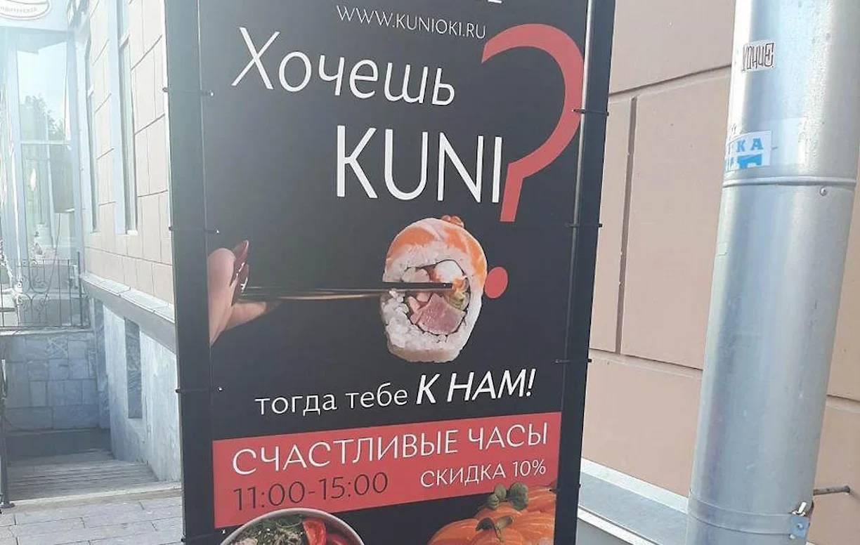 Сотрудниками Пермского УФАС возле дома №68 по Комсомольскому проспекту в краевом центре был замечен щит с рекламой услуг и товаров кафе японской кухни KuniOki, которое располагается в этом здании. Содержание информации было оценено специалистами как непристойное.